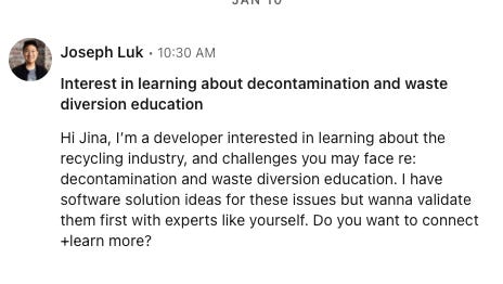 In my case, I decided that the people I should speak to are recycling coordinators or waste diversion managers and educators whose charter is to educate people about decontamination. I have little experience in this industry so resorted to LinkedIn mailing around 15 or so people who fit the profile I was seeking. I used a free trial of LinkedIn’s premium tier which capped me at 15 InMails.